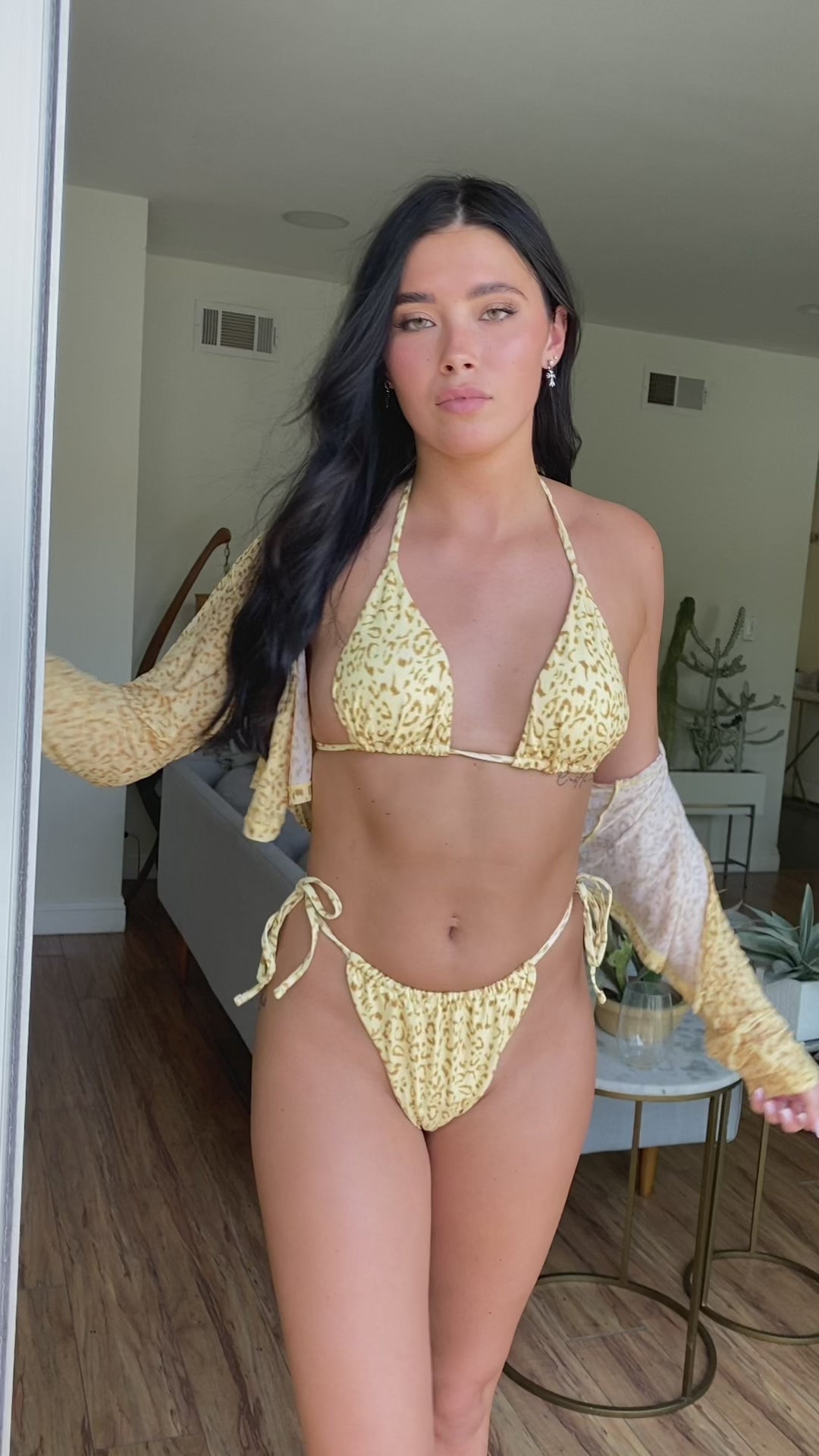 Hi, Macie 🤩 Level up a classic triangle bikini with a bold yellow and burnt orange leopard pattern. These bikini bottoms are high waisted, have tie closures at sides, and cheeky bottom coverage.